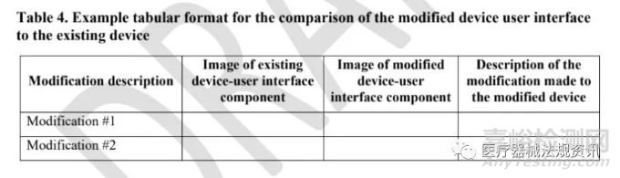 當修改現(xiàn)有器械時,F(xiàn)DA建議提交者將新器械用戶界面與他們自己的現(xiàn)有器械進行比較。FDA建議以表格形式完成這一比較。表格格式示例如表4所示。