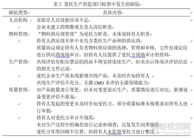 由于委托生產(chǎn)導(dǎo)致了質(zhì)量事件屢見不鮮,如廣東怡康制藥委托韶關(guān)市居民制藥生產(chǎn)抗骨增生片,由于受委托企業(yè)存在中西藥生產(chǎn)交替共線,清場不徹底等問題,導(dǎo)致抗骨增生片與氯芬黃敏片發(fā)生了交叉污染,兩家企業(yè)都被收回了GMP證書。美國新基生物醫(yī)藥委托美國當(dāng)?shù)匾患夜旧a(chǎn)注射用紫杉醇,國家局在境外委托生產(chǎn)現(xiàn)場檢查發(fā)現(xiàn)部分關(guān)鍵生產(chǎn)設(shè)施不符合中國GMP,存在生產(chǎn)過程無菌控制措施不到位等問題,遭到產(chǎn)品暫停出口、銷售、使用,市場被國內(nèi)企業(yè)占領(lǐng),失去原本擁有的市場絕對主導(dǎo)權(quán)。委托生產(chǎn)藥監(jiān)部門檢查中發(fā)生的缺陷如表2所示。