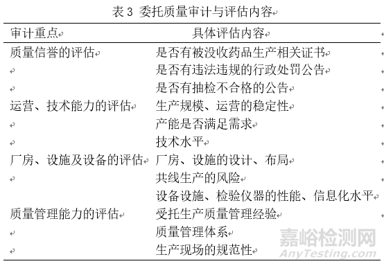 委托合作方的選擇依賴于質(zhì)量審計和評估,通過問卷調(diào)研選擇潛在受托方,通過實地審計選擇意向受托方,最后做好評估報告確定受托方[7]。質(zhì)量審計與評估的內(nèi)容如表3所示。