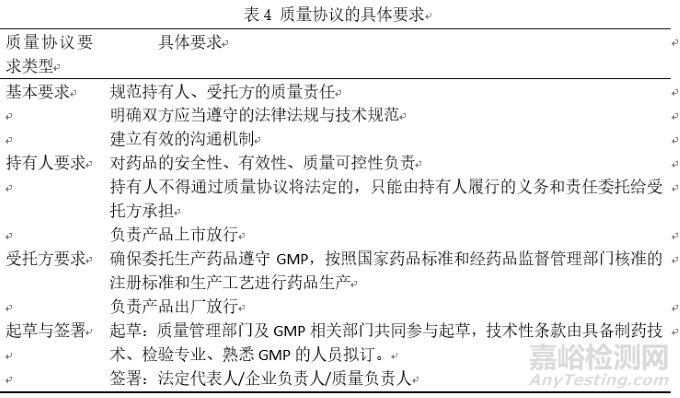 質(zhì)量協(xié)議的具體內(nèi)容梳理如表5所示,質(zhì)量協(xié)議的內(nèi)容應(yīng)該進(jìn)行文件標(biāo)準(zhǔn)化,并對雙方相關(guān)人員進(jìn)行培訓(xùn),委托方與受托方應(yīng)建立良好的溝通,以書面形式記錄質(zhì)量溝通結(jié)果,并由雙方審核簽字。