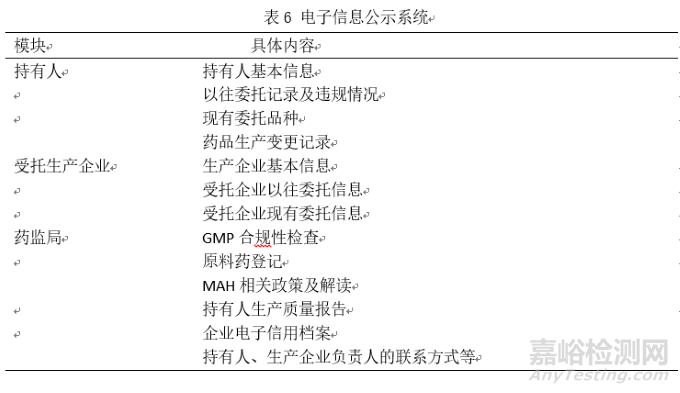 信息流通。通過該數(shù)據(jù)庫, 藥監(jiān)部門應(yīng)當(dāng)對將檢查的藥品資料有一個清晰的認(rèn)識, 對需要檢查的內(nèi)容也能有的放矢。該數(shù)據(jù)庫也使藥品持有人可以隨時跟進(jìn)委托藥品的生產(chǎn)和相關(guān)檢查情況。此外, 為了避免各地藥監(jiān)部門對委托藥品消極檢查的情況, 建議設(shè)立相應(yīng)的協(xié)調(diào)部門或?qū)I(yè)負(fù)責(zé)各地監(jiān)管政策溝通部門, 確保各地監(jiān)管政策能有序銜接, 信息公示系統(tǒng)的相關(guān)模塊與內(nèi)容見表6。