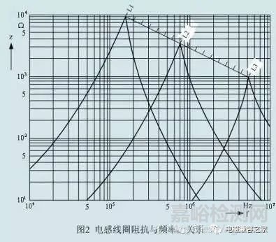 圖2是普通電感線圈的阻抗與頻率之間的關(guān)系圖。從圖中可以看出,電感線圈的阻抗隨頻率的增加而增加,但當(dāng)其阻抗增加到最高值時,由于并聯(lián)電容的作用,阻抗隨頻率的增加而迅速下降。當(dāng)阻抗增加到最高值時,電感線圈的分布電容等效電感引起并聯(lián)諧振。在圖中,L1>L2>L3.可見電感線圈的電感越多,諧振頻率越低。從圖2可以看出,如果頻率為1,MHz抑制電磁干擾,選擇L1還不如采用L3,由于L3的電感比L一小十倍以上,因此L3成本也要比L1低很多。