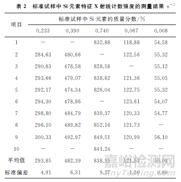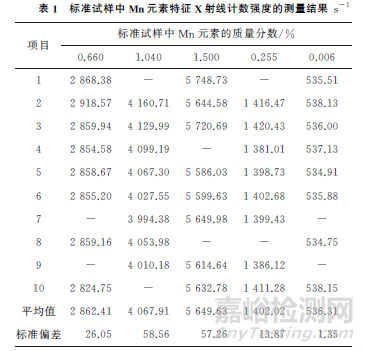 使用校準曲線法對待測試樣進行定量測試和測量不確定度的計算,低含量元素的定量結果也有很好的穩(wěn)定性和重現(xiàn)性。取包含因子k=2時,待測試樣中Mn元素的質(zhì)量分數(shù)為0.12%,擴展不確定度為0.0048%;Si元素的質(zhì)量分數(shù)為1.36%,擴展不確定度為0.042%。