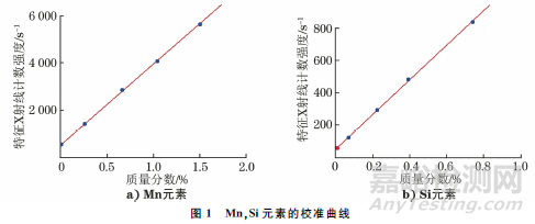 對于低合金鋼中低合金元素的電子探針微區(qū)定量測試,使用標準試樣建立校準曲線法是一種很好的定量分析方法。各低含量合金元素在測試條件合適的情況下,元素的質(zhì)量分數(shù)和特征X射線計數(shù)強度具有很好的線性關系。