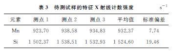 在待測試樣上隨機選擇3個點,分別測量Mn,Si元素的特征X射線計數(shù)強度,結果如表3所示。將Mn,Si元素的特征X射線計數(shù)強度平均值分別代入式(1)和(2),可以得到Mn和Si元素的質(zhì)量分數(shù)分別為0.12%和1.36%。