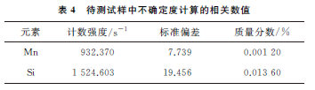 將表1,2中的數(shù)據(jù)代入GB/T 15247—2008附錄A中的不確定度計算公式,得到待測試樣中不確定度計算的相關數(shù)值如表4所示。由表4中的相關數(shù)值計算可得,待測試樣中Mn元素的測量不確定度為0.0024%,Si元素的測量不確定度為0.021%。