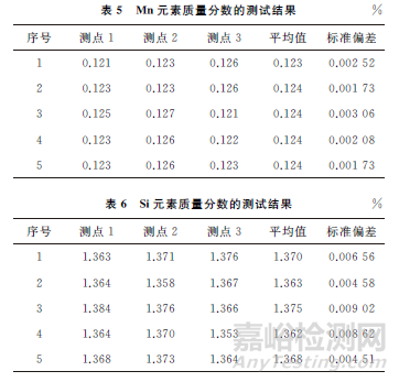 使用同一臺儀器,在同樣的測試條件和方法下,對待測試樣進行5組測試,每組3個測試點,Mn和Si元素質(zhì)量分數(shù)的測試結果分別如表5,6所示。