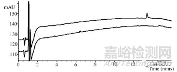 圖13。上圖顯示梯度系統(tǒng)色譜圖(甲醇,265納米),在線脫氣效率低。用氦氣吹掃洗脫液后,產(chǎn)生較低的痕量。