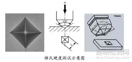 維氏硬度測量原理與布氏硬度相似。采用相對面夾角為136°金剛石正四棱錐壓頭,以規(guī)定的試驗力F壓入材料的表面,保持規(guī)定時間后卸除試驗力,用正四棱錐壓痕單位表面積上所受的平均壓力表示硬度值,標記符號為HV。