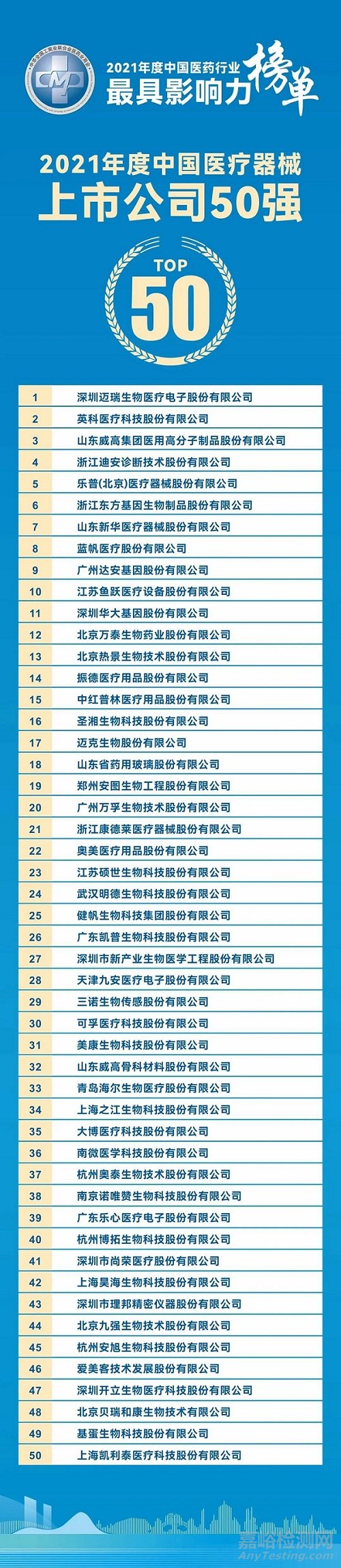 據(jù)“醫(yī)療器械上市公司50強”榜單,2021年我國醫(yī)療器械上市公司中,邁瑞醫(yī)療第一,英科醫(yī)療位列第二,威高第三。