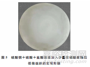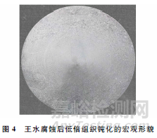 為了使試樣呈現(xiàn)出均勻的低倍組織,在試樣檢驗(yàn)面的粗糙度達(dá)到要求后,要根據(jù)鋼種選擇合適的酸洗液,否則會(huì)出現(xiàn)不腐蝕或鈍化現(xiàn)象。針對(duì)高溫合金耐腐蝕的特性,目前較多采用的酸洗液為硫酸銅+硫酸+鹽酸溶液和王水,都是在25℃環(huán)境下進(jìn)行腐蝕。在實(shí)際生產(chǎn)應(yīng)用中,硫酸銅+硫酸+鹽酸溶液基本可以解決各種牌號(hào)的Fe-Ni基、Ni基及Co基等高溫合金的低倍腐蝕;而用王水腐蝕某些牌號(hào)的高溫合金時(shí)有低倍組織鈍化的現(xiàn)象(見(jiàn)圖4)。