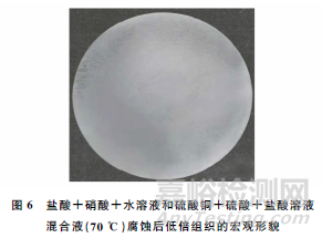 當(dāng)酸洗液溫度較低時(shí),低倍組織極易出現(xiàn)不均勻和部分缺陷未能顯現(xiàn)的情況;適當(dāng)提高酸洗液的溫度,會(huì)使腐蝕的時(shí)間縮短,缺陷顯現(xiàn)較完全。對(duì)于25℃下試樣腐蝕效果不佳的溶液,在較高溫度下酸洗就可以得到較均勻的低倍組織。將鹽酸+硝酸+水溶液(鹽酸∶水∶硝酸的體積比為10∶10∶1)和硫酸銅+硫酸+鹽酸溶液按照15∶1(摩爾比)混合,加熱到70℃,酸洗30~60min,可見(jiàn)試樣腐蝕均勻且組織清晰(見(jiàn)圖6)。在酸洗過(guò)程中,斑點(diǎn)狀偏析、黑斑等偏析類(lèi)缺陷可以首先顯現(xiàn),避免了因溶液濃度低、腐蝕時(shí)間短而使缺陷不易顯現(xiàn)的問(wèn)題。對(duì)于使用刷洗方式進(jìn)行低倍組織檢驗(yàn)的大尺寸試樣,采用40℃含有少量濃硝酸的硫酸銅+硫酸+鹽酸溶液,腐蝕時(shí)間會(huì)相對(duì)較短,腐蝕均勻且低倍組織清晰。另一方面,相較于腐蝕時(shí)間的延長(zhǎng),提高酸洗液的溫度更為關(guān)鍵,這樣能夠使得低倍組織和缺陷完全顯現(xiàn),檢驗(yàn)面干凈、清晰。