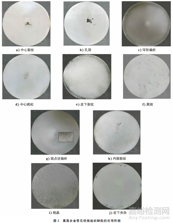 高溫合金在前期冶煉、后期冷熱成形及熱處理環(huán)節(jié)中,往往會(huì)因?yàn)楣に?、生產(chǎn)操作及設(shè)備等因素產(chǎn)生各種低倍組織缺陷,使得產(chǎn)品降級(jí)使用或者直接判廢,造成很大的損失。為了更好地了解缺陷產(chǎn)生機(jī)理,控制缺陷的發(fā)生,必須對(duì)缺陷進(jìn)行準(zhǔn)確定性。圖2為高溫合金常見(jiàn)低倍組織缺陷的宏觀(guān)形貌,可以通過(guò)對(duì)比形貌的方法對(duì)部分缺陷予以甄別。