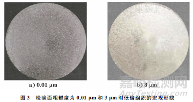 粗糙度作為低倍酸洗試樣制備環(huán)節(jié)的一項(xiàng)要求,對(duì)腐蝕時(shí)間、缺陷觀(guān)察等都有顯著影響,通常要求檢驗(yàn)面粗糙度不大于3.2μm。在高溫合金酸洗過(guò)程中,檢驗(yàn)面粗糙度越小,試樣越容易被腐蝕,缺陷越容易顯現(xiàn)出來(lái)。同時(shí)在腐蝕結(jié)束后,可以觀(guān)察到試樣整個(gè)面腐蝕比較均勻,局部組織的粗細(xì)界限清楚,針孔、非金屬夾雜、疏松等缺陷較容易顯現(xiàn)。當(dāng)粗糙度較大時(shí),會(huì)影響試樣宏觀(guān)形貌及細(xì)小缺陷的顯現(xiàn)和觀(guān)察,對(duì)低倍組織的評(píng)定造成干擾。因此,在試樣制備時(shí),檢驗(yàn)面在標(biāo)準(zhǔn)要求的粗糙度范圍內(nèi)盡可能精車(chē)加工,尤其對(duì)于低倍組織質(zhì)量要求較高的材料,粗糙度越小越好。圖3是試樣檢驗(yàn)面粗糙度為0.01μm和3μm時(shí)低倍組織的宏觀(guān)形貌。