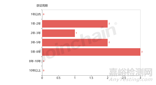 從產(chǎn)品注冊周期來看,家用呼吸機(jī)(生命支持)產(chǎn)品注冊周期在5年-8年的產(chǎn)品數(shù)量最多,有3件。