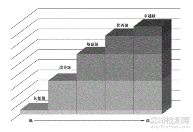 成熟度等級自低向高分別是一級(初始級)、二級(改善級)、三級(規(guī)范級)、四級(優(yōu)秀級) 和五級(卓越級)。較高的成熟度等級涵蓋了低等級的要求,等級的提升應(yīng)通過漸進(jìn)的方式來實(shí)現(xiàn)。