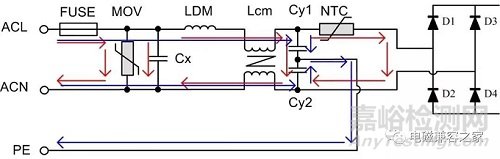 對ACL與ACN兩者之間施加的浪涌電壓稱為差模浪涌電壓,差模路徑如圖中紅線所示;是的,ACL(或ACN)與PE兩者之間施加的電壓稱為共模浪涌電壓,共模路徑如圖藍線所示。