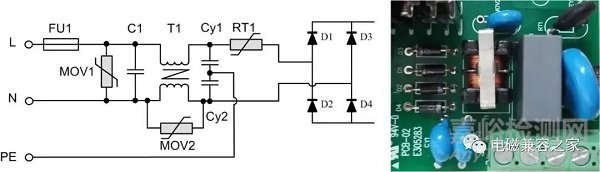 背景:以某型號的電源模塊為例,該模塊就是ZLG輸入85VAC~350VAC,且EMC模塊中嵌入前級電路電路??估擞啃枰?個差動模塊電壓KV,共模電壓6KV。更換更大的保險絲后,它可以承受6KV差模電壓。前級原理圖及相應(yīng)實物圖如圖2所示。