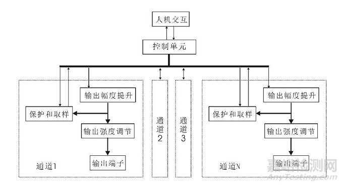 產(chǎn)品從內(nèi)部功能原理來看,是一臺(tái)單通道或多通道,帶輸出幅度調(diào)節(jié)裝置的脈沖信號發(fā)生器,產(chǎn)品的功能原理框圖見圖2。