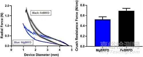 圖3 抗壓測試結(jié)果,左圖,對MgBRFD和FeBRFD所施加的力與裝置直徑間的關(guān)系,實線和較淺的陰影代表平均值±標準差;右圖,MgBRFD和FeBRFD的抗壓強度
