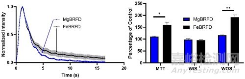 圖4 左圖,MgBRFD和FeBRFD的歸一化時間密度曲線,實線和較淺的陰影同樣代表了平均值±標準差;右圖,MgBRFD和FeBRFD的造影劑平均通過時間MTT、進瘤斜率WIS-1和出瘤斜率WOS-1的比較,其中MTT和WOS-1兩組間有統(tǒng)計學差異,提示FeBRFD的血流導向功能更好