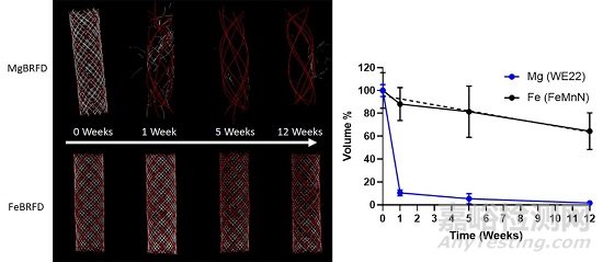 圖5 左圖,隨著時間的推移,MgBRFD和FeBRFD的代表性顯微CT 3D渲染圖,其中紅色代表鉭Ta,白色代表生物可吸收金屬絲;右圖,隨時間推移,兩種裝置中生物可吸收絲體積的減少曲線