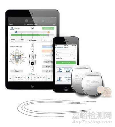 ST. JUDEMEDICAL™ Infinity DBS系統(tǒng)。其中,脈沖發(fā)生器通過導線與大腦通訊,iOS設備可使醫(yī)生調(diào)整設置進行個性化治療。