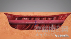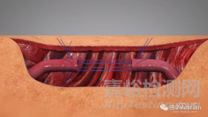 ▲保持對(duì)稱的同時(shí)將8根針插入血管周圍