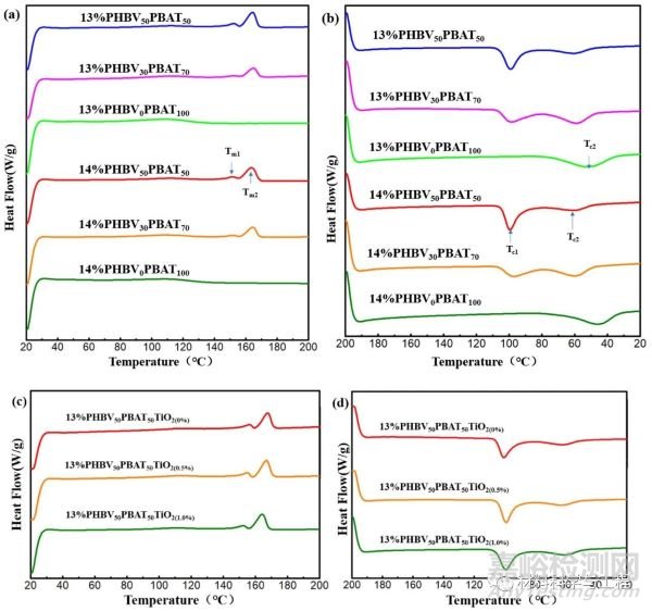 圖 4。不同混合系統(tǒng)的 PHBV/PBAT 樣品和 TiO2 樣品的 DSC 熱分析圖: