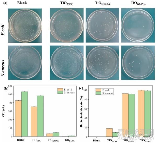 (b)平均菌落形成單位數(shù),(c)對應(yīng)的抑菌率空白樣品和PHBV/PBAT/TiO 2納米纖維膜。