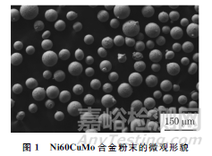 基體材料選用鑄態(tài)ZL109鋁合金,涂層原料粉選用Ni60CuMo合金粉末,平均粒徑約為95μm,微觀形貌如圖1所示,可知顆粒的形貌近似球形。對基體進行超聲清洗,再進行噴砂處理后,采用等離子噴涂設(shè)備在其表面制備Ni60CuMo合金涂層,以氬氣作為主要保護氣體,氫氣作為次要保護氣體,基于前期工作得到等離子噴涂工藝參數(shù)進行探究。