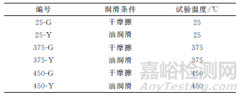 采用掃描電子顯微鏡(SEM)觀察涂層的表面和截面微觀形貌,并用SEM附帶能譜儀(EDS)進行微區(qū)成分分析。利用單晶X射線衍射儀(XRD)對粉體與涂層的物相組成進行分析。采用數(shù)顯顯微硬度儀測涂層的截面顯微硬度分布。在800倍放大倍數(shù)下隨機選取5張涂層SEM截面圖像,并對涂層截面孔隙進行灰度處理,用ImageJ2x圖像處理軟件計算孔隙率。在涂層試樣上截取尺寸為20mm×10mm×5mm的磨損試樣,經(jīng)400# 、600# 、800# 、1000#的碳化硅砂紙依次打磨處理,并用酒精超聲清洗后,選用高溫摩擦磨損試驗機對涂層進行圓環(huán)式滑動磨損試驗,接觸形式為點接觸,對磨件為直徑5mm的GCr15鋼球,磨損載荷為50N,轉(zhuǎn)速為200 r·min-1,磨損時間為20min,磨損半徑為1.5mm;由于活塞服役于高溫、貧/富油狀態(tài)下,最高服役溫度在326~426℃間,因此選用溫度區(qū)間內(nèi)的375℃,室溫(25℃)及苛刻服役溫度450℃作為涂層磨損試驗溫度,具體潤滑條件和試驗溫度如表1所示,潤滑油選用汽油機油,相同試驗條件下進行2次平行試驗,使用電子天平對磨損前后試樣的質(zhì)量進行稱量,計算磨損質(zhì)量損失。選用三維形貌儀對磨損后試樣表面三維形貌進行觀察,并采用掃描電鏡觀察磨損形貌。