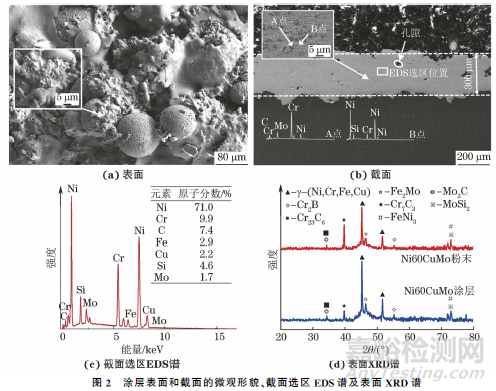 由圖2可知:所制備涂層表面熔滴鋪展?fàn)顩r良好,熔融粒子撞擊至基體表面后經(jīng)堆垛、鋪展后以放射形式、破碎形式凝固,部分熔滴包裹著未熔顆粒,而這些未熔顆粒表面熔滴的冷卻凝固使顆粒間相互結(jié)合從而形成典型層狀結(jié)構(gòu)的涂層;由于部分未熔顆粒堆疊,后續(xù)的熔融粒子未能完全潤濕填充這些不規(guī)則區(qū)域,從而在涂層內(nèi)部形成孔隙?;w與涂層界面處結(jié)合較致密,涂層厚度約為300μm,高倍下觀察發(fā)現(xiàn)涂層內(nèi)部由2種顏色(深灰色、淺灰色)區(qū)域交替重疊構(gòu)成,經(jīng)EDS分析發(fā)現(xiàn)深灰色區(qū)域為富鉻區(qū),淺灰色區(qū)域為富鎳區(qū)。由EDS分析發(fā)現(xiàn)涂層截面無明顯的元素擴散現(xiàn)象,因此涂層與基體間的結(jié)合方式為機械結(jié)合;同時選區(qū)中未檢測出氧元素,說明在熔滴飛行過程中未出現(xiàn)氧化現(xiàn)象,工作氣體對熔滴起到了良好的保護作用。涂層保留了原料粉末的物相組成,均主要由γ-(Ni,Cr,Fe,Cu)固溶體、FeNi3、Cr7C3、Cr23C6、Mo2C、MoSi2、Fe2Mo等組成。