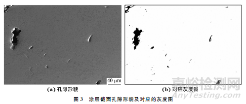 圖3為涂層截面孔隙形貌及對應(yīng)的灰度圖,統(tǒng)計得到涂層的平均孔隙率為2.48%。涂層中孔隙形態(tài)多樣,除了分布廣泛的獨立閉合微孔外,還有少量由多個微孔交互連通的通孔。由于噴涂時熔滴包裹未熔顆粒周圍,其堆積和搭接具有隨機性,因此涂層中極易出現(xiàn)因填充不充分而形成的孔隙聚集現(xiàn)象。