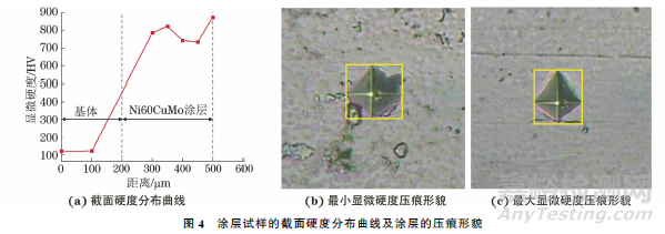 由圖4可知,涂層截面顯微硬度呈小范圍波動,其中最高硬度可達874HV,最低硬度為735HV,平均硬度為792.91HV,基體的平均硬度約為123HV,涂層的硬度為基體的6倍以上。在涂層中分富鎳區(qū)與富鉻區(qū),富鉻區(qū)分布不均勻,硬度測試時壓痕的隨機性使得顯微硬度出現(xiàn)波動。在施加載荷初期,壓痕處孔隙等微缺陷處產(chǎn)生應(yīng)力集中而出現(xiàn)裂紋,在壓應(yīng)力作用下壓痕長度增加,因此硬度較小。涂層的孔隙等微缺陷主要集中在涂層中間部分,因此中間部分的硬度較低。在粒子撞擊的夯實作用下涂層近表層處的加工硬化效果增強,因此顯微硬度較高。