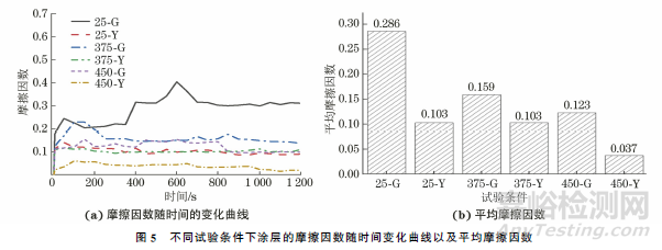 由圖5可知:在不同潤滑條件下涂層在試驗前期0~150s時間內(nèi)的摩擦因數(shù)急劇增加并隨之在短時間內(nèi)達到平穩(wěn)狀態(tài),而后又出現(xiàn)波動現(xiàn)象,其中干摩擦條件下涂層的摩擦因數(shù)較大,且波動較大,這是因為此時涂層與對磨件間無潤滑液和保護膜,表面直接接觸,磨損劇烈。隨著試驗溫度由25℃升高至450℃,涂層的平均摩擦因數(shù)降低。油潤滑條件下涂層的摩擦因數(shù)更加平穩(wěn),平均摩擦因數(shù)偏低,并且摩擦因數(shù)達到平穩(wěn)階段所需時間較短,短于100s,說明潤滑油在涂層與對磨件之間形成的油膜起到了減摩耐磨的效果;油膜使涂層與對磨件表面分離,發(fā)生流體潤滑,在壓力作用下,部分潤滑油進入涂層孔隙中起到了儲油作用,為摩擦表面持續(xù)提供油膜所需的潤滑油,使表面油膜不易破損;450℃時涂層的平均摩擦因數(shù)最低,表現(xiàn)出優(yōu)異的減摩效果。