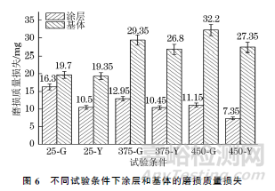 由圖6可以看出:涂層的磨損質(zhì)量損失隨試驗溫度的升高和油潤滑條件的施加而減小,而基體的磨損質(zhì)量損失隨試驗溫度升高而增大,但施加潤滑油后磨損質(zhì)量損失略微減小,對比發(fā)現(xiàn)施加潤滑油后涂層耐磨性提升的程度比基體顯著;相同試驗溫度和潤滑條件下涂層的磨損質(zhì)量損失明顯低于基體,在450℃油潤滑條件下涂層的磨損質(zhì)量損失僅為7.35mg,為基體的1/4左右,說明涂層具有優(yōu)異的耐磨性能。