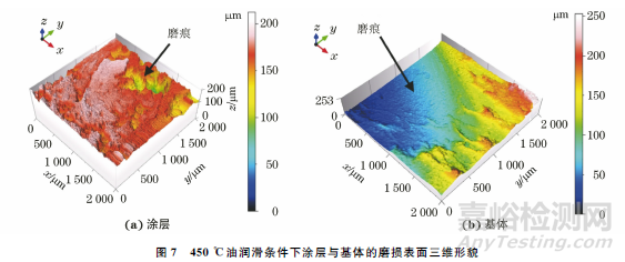 由圖7可以發(fā)現(xiàn),在450℃油潤滑條件下涂層磨痕的最大峰高為46.9μm,基體磨痕的最大峰高為155.7μm,涂層磨痕很淺,進一步說明涂層在高溫下具有優(yōu)異的耐磨性能。