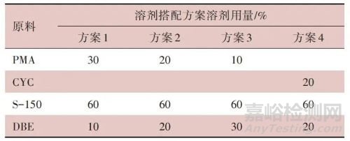 按照表6的溶劑方案配制涂料,隨著DBE的增加,漆膜的光澤提高,在DBE添加量20%時(shí)即可獲得80GU的漆膜外觀(高光底漆),繼續(xù)增加DBE到30%,覆涂面漆時(shí)有起泡的傾向,可能是DBE在底漆膜中殘留,涂覆面漆后造成氣泡的異常,所以選擇方案二為溶劑方案。方案四將PMA替換為CYC,兩者的沸點(diǎn)接近,且都能較好地溶解聚酯樹(shù)脂,得到的漆膜性能也相近,但是CYC氣味較重,最終選擇含PMA的方案二作為溶劑方案。