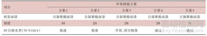 在本實(shí)驗(yàn)中,所使用的環(huán)氧樹(shù)脂是液態(tài)的E51樹(shù)脂,添加量為7%,在漆膜中起到增塑和增加附著力的作用。表4是環(huán)氧樹(shù)脂組合方案,表5是不同組合方案的漆膜性能。