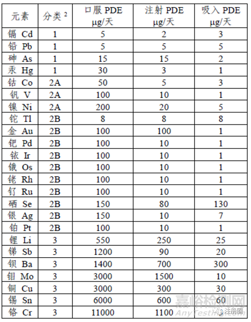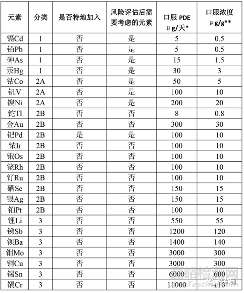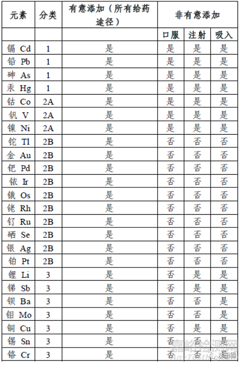 ②可能存在于原料藥或輔料(物料)中的潛在元素雜質(zhì),如口服給藥可能存在1類和2A類,對(duì)于注射和吸入給藥途徑,需評(píng)估1類、2A類和3類元素。