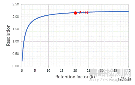 由圖3可知,當(dāng)保留因子K≤5時(shí),通過改變K值,分離度都能得到極大的改善。當(dāng)保留因子K≥10,通過改變K值,分離度得到的改善卻極小。因此,方法開發(fā)過程中,如果色譜峰的保留因子K≤5,此時(shí)通過改變K值便能有效的改善分離。如果色譜峰的保留因子K≥10,此時(shí)通過改變保留因子K將會(huì)收效甚微。因此當(dāng)保留因子K≥10時(shí),改變其他參數(shù)將會(huì)更加有效。