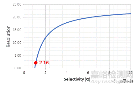 實(shí)際工作中,對于選擇性α我們所用到的區(qū)域一般都是1≤α≤2的區(qū)域。為什么應(yīng)用僅僅在此區(qū)域內(nèi)呢?筆者用以下案例為大家解讀。色譜分離中,一般保證溶質(zhì)的K介于1≤K≤10區(qū)間內(nèi)。假設(shè)某物質(zhì)分離條件為4.6*250mm,5um的色譜柱,流速為1.0ml/min,此時(shí)t0≈2.5min。當(dāng)某物質(zhì)保留因子K1=1,若α=2,則相鄰物質(zhì)K2=2,此時(shí)兩物質(zhì)的保留時(shí)間分別為t1≈5.0min, t2≈7.5min,這種情況下,二者已經(jīng)完全分離。因此選擇性α>2時(shí),分離度Rs已經(jīng)滿足要求,不必再改善分離。所以,選擇性α在1≤α≤2的區(qū)域才有改善的必要。