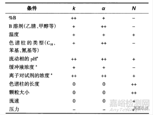 由圖6可知,塔板數(shù)N受影響條件較多,其中色譜柱長度和顆粒大小是影響塔板數(shù)N的主要條件,其具體計(jì)算公式前文也已經(jīng)有論述,其他條件對塔板數(shù)N的影響相對較小。保留因子K主要影響因素包括有機(jī)相比例B%,流動(dòng)相pH以及離子對試劑濃度。對于不可電離的物質(zhì)而言,流動(dòng)相pH以及離子對試劑濃度對保留因子K就不再是主要影響因素。選擇性α的主要影響因素為溶劑種類、色譜柱類型、流動(dòng)相pH以及離子對試劑濃度,其他條件影響相對略小。當(dāng)然有些分離條件對三要素的影響并不是孤立的,比如流動(dòng)相pH,在改變保留因子K的同時(shí)也改變了選擇性α。因此,當(dāng)我們明白分離條件對塔板數(shù)N,保留因子K,選擇性α的影響大小之后,后期開展工作才會(huì)有的放矢,更加高效。