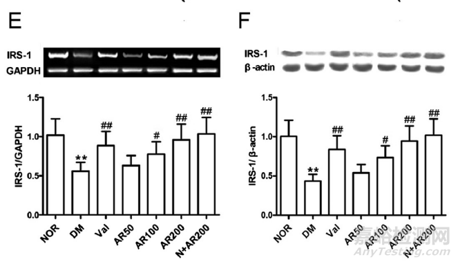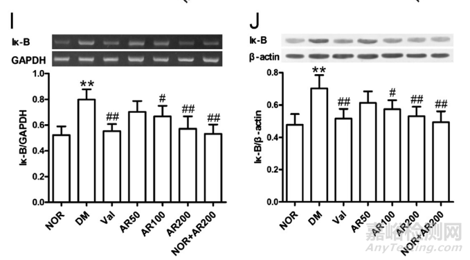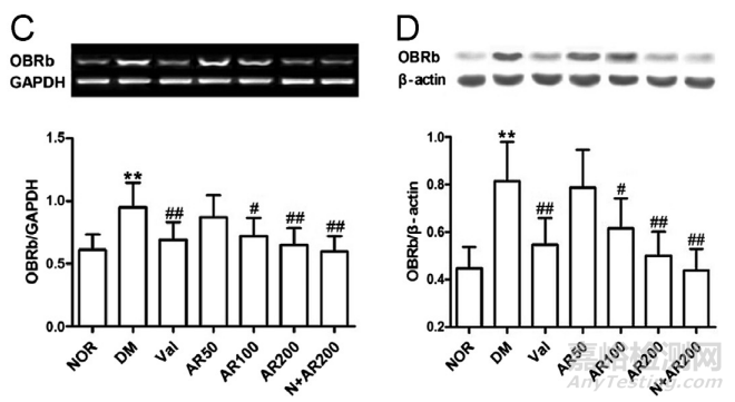 在高脂肪飲食和低劑量STZ治療的糖尿病大鼠的睪丸中,StAR、OBRb、IRS-1、CHOP和IκBβ水平出現(xiàn)顯著異常。與對(duì)照組相比,在糖尿病睪丸病中,StAR ((A)、(B))和IRS-1 ((C)、(D))的表達(dá)減少,與OBRb ((E)、(F))、CHOP ((G)、(H))和IκBβ(I)、(J) 的表達(dá)增加相關(guān),這是顯著的。這些變化分別通過(guò)大精酸(50、100、200 mg/kg,i.g .)或纈沙坦(12 mg/kg,i.g .)緩解。平均S.D .,n= 10。*P<0.05,**P<0.01,與正常(NOR)比較;#P< 0.05,#P<0.01,與糖尿病(DM)比較。