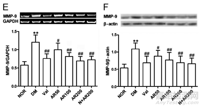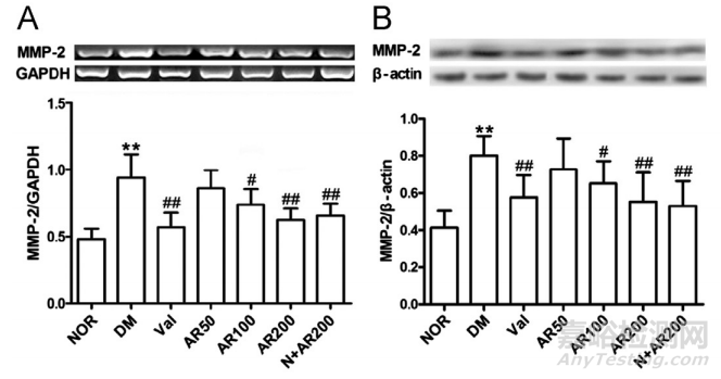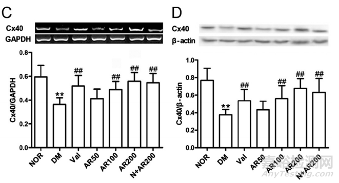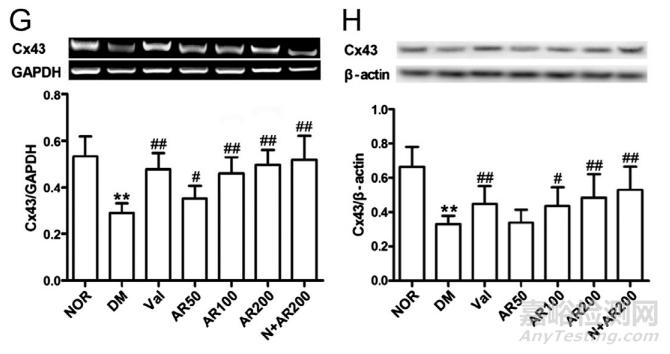 在糖尿病大鼠睪丸中,MMP2 ((A)、(B))、MMP9 ((C)、(D))、Cx40 ((E)、(F))和Cx43 ((G)、(H))的mRNA表達(dá)和western blot有明顯改變。通過(guò)體內(nèi)大精酸或纈沙坦干預(yù),這些變化顯著減弱。平均S.D .,n= 10。*P< 0.05,**P< 0.01,與正常(NOR)比較;#P< 0.05,##P< 0.01,與糖尿病(DM)比較。