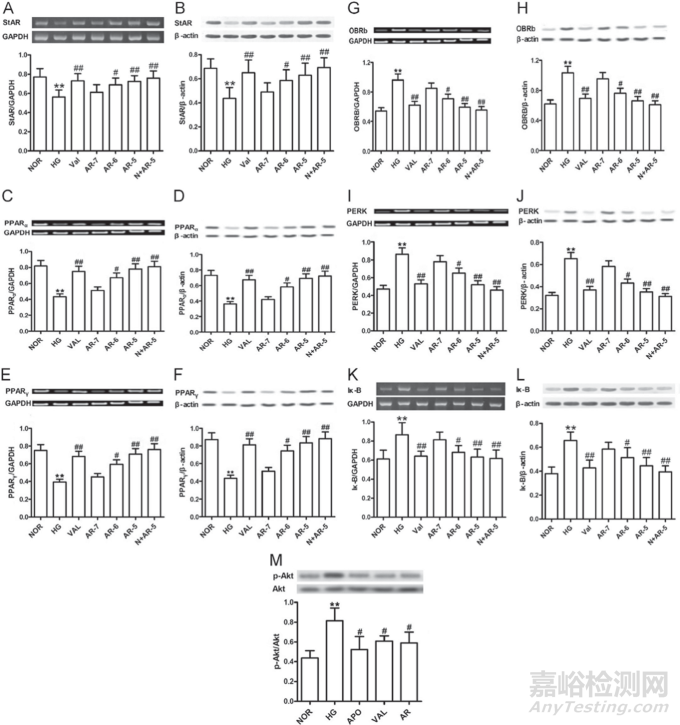 圖6。在高葡萄糖培養(yǎng)基培養(yǎng)60 min的體外睪丸間質(zhì)細(xì)胞(Leydig cells)中,發(fā)現(xiàn)StAR ((A)、(B))、PPARα ((C)、(D))、PPARγ ((E)、(F))、OBRb ((G)、(H))、PERK ((I)、(J))和IκBβ ((K)、(L))的RT-PCR和蛋白分布發(fā)生顯著改變。這些變化通過(guò)大精酸(10-7,10-6,10-5M)或纈沙坦(10-6M)得到緩解。(M) 在高葡萄糖培養(yǎng)的Leydig細(xì)胞中發(fā)現(xiàn)p-Akt/Akt上調(diào),分別被大精酸(10-5M)、纈沙坦(10-6M)和APO(羅布麻苷10-5M, NADPH氧化酶阻斷劑)抑制。平均S.D .,n = 5-6。*P< 0.05,**P< 0.01,與正常(NOR)比較;#P< 0.05,#P<0.01,與高糖(HG)比較。(A) 睪丸間質(zhì)細(xì)胞中的StAR,(B) 睪丸間質(zhì)細(xì)胞中的StAR 細(xì)胞,(C) 睪丸間質(zhì)細(xì)胞中的PPARα,(D) 睪丸間質(zhì)細(xì)胞中的PPARα,(E) 睪丸間質(zhì)細(xì)胞中的PPARγ,(F) 睪丸間質(zhì)細(xì)胞中的PPARγ,(G) 睪丸間質(zhì)細(xì)胞中的OBRb,(H) 睪丸間質(zhì)細(xì)胞中的OBRb,(I) 睪丸間質(zhì)細(xì)胞中的PERK,(J) 睪丸間質(zhì)細(xì)胞中的PERK,(K) 睪丸間質(zhì)細(xì)胞中的IκBβ,(L) 睪丸間質(zhì)細(xì)胞中的Iκ-Bβ和(M) 睪丸間質(zhì)細(xì)胞中的p-Akt/Akt。