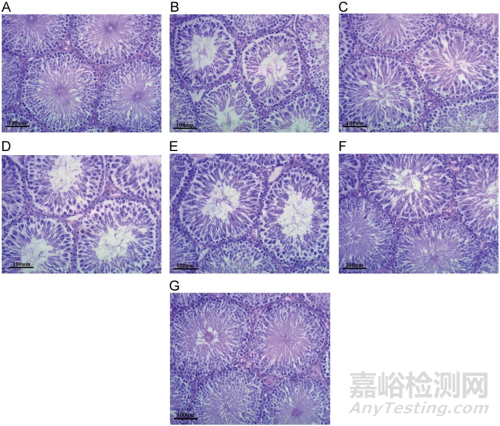 睪丸組織用10%中性福爾馬林固定,包埋在石蠟中,切成5mm厚的片,用常規(guī)蘇木精-伊紅(H-E)染色處理。病理學(xué)家在對(duì)實(shí)驗(yàn)剖面不了解的情況下,在光學(xué)顯微鏡下對(duì)所有切片進(jìn)行檢查,并在200倍放大倍數(shù)下拍照(馮等人,2007)。