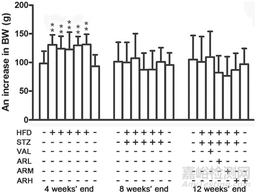 圖1。在進(jìn)入實(shí)驗(yàn)時(shí),與基線相比,以3天的間隔監(jiān)測(cè)體重增加(g)。在第4、8、12周末的3個(gè)時(shí)間點(diǎn)進(jìn)行比較。高脂肪飲食(HFD)在4周結(jié)束時(shí)產(chǎn)生更大的體重增加,并且在第5周開始時(shí)給予單次低劑量的鏈脲佐菌素(STZ,35 mg/kg,i.g .),消除了在8周結(jié)束時(shí)HFD增加的體重。大精酸(ARL,ARM,ARH: 50,100和200)或纈沙坦(Val: 12)的干預(yù)(mg/kg,i.g .)在過(guò)去4周內(nèi)進(jìn)行,并且不改變體重。平均標(biāo)準(zhǔn)差,n = 10。**P < 0.01,相對(duì)于正常值(NOR)。
