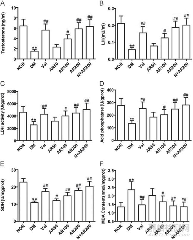 在接受高脂肪飲食和低劑量STZ治療的糖尿病大鼠中,發(fā)現(xiàn)血清中睪酮(A)減少、LH (B)減少,睪丸中LDH (C)、酸性磷酸酶(D)和SDH (E)活性降低,MDA (F)增加,并且通過(guò)分別用大精酸(50、100、200)和纈沙坦(12)治療(mg/kg,即)顯著緩解了這些變化。平均S.D .,n =10。*P<0.05,**P<0.01,與正常組比較;#P <0.05,#P< 0.01,與糖尿病組相比。